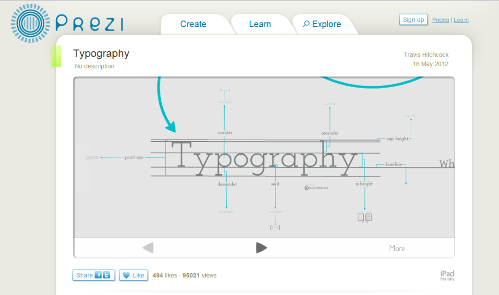 Prezi allows the user to move through screens in a presentation by zooming in and out on places of interest. Words don’t do it justice but this presentation on Typography shows that a fairly boring subject can look interesting with the right tool: