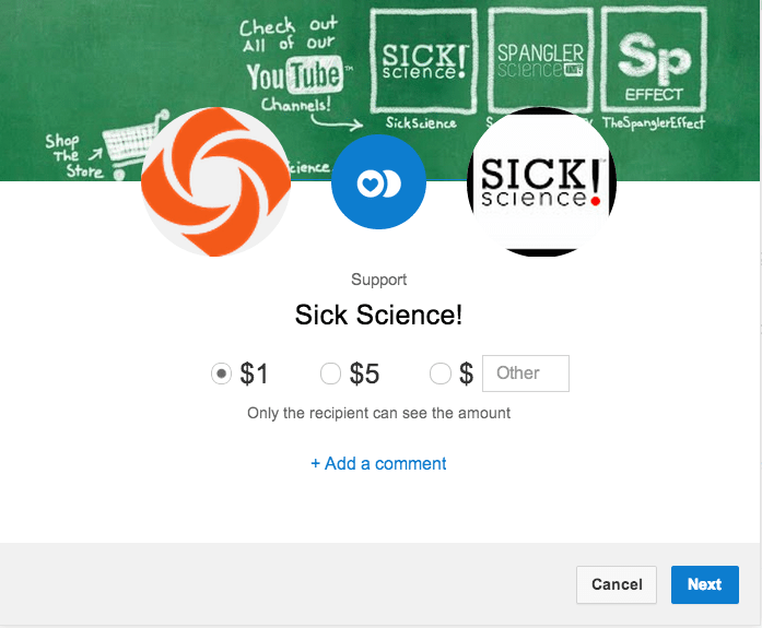 YouTube’sFanFunding is the logical next step from this.As YouTube describes the feature, “We’ll be adding another option for you, where fans will be able to contribute money to support your channel at any time, for any reason. A handful of creators are testing this feature on desktop and Android…. If you’re interested in trying it on your channel, sign up here.” The “Support this channel” image shows on the left on the channels testing the feature, and when you click it, you’ll get the one on the right, soliciting a modest donation.