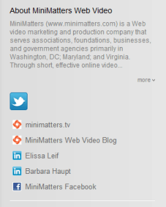 As part of its new channel design, YouTube has begun allowing you to link from your channel page to any other point on the Web. Twitter, Facebook, and Google+/Okrut are offered as integrated options to choose. (Orkut is a social networking Web site that Google owns. It’s more popular outside the United States.) But you can also can type in any URL and a short title for your link. When we typed in our LinkedIn page URLs, it automatically pulled in the LinkedIn icon, too. The graphic here shows what appears on the right side of the MiniMatters YouTube channel now that we’ve updated the links.