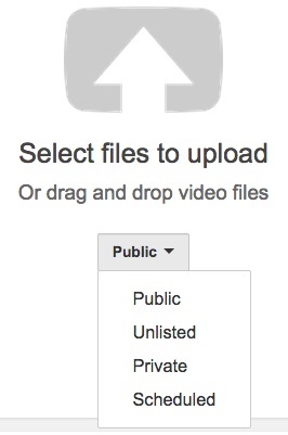 1. Check to see if you already at the level that allows YouTube video scheduling and don’t need to do anything more. Click upload, and click the downward facing triangle to the right of the word “public.” Does the option “Scheduled” appear? If so, you are ready to go, and skip to the bottom of this post.