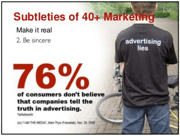 We caught up with Erin Read of Creating Results, a strategic marketing agency with expertise in generational marketing, to talk about authenticity. She kindly let us use the slide here from Creating Result’s slide deck presentation, The Power of Generational Marketing. She said that unlike the Greatest Generation and their predecessors, Baby Boomers on down to millennials favor authenticity in marketing. People in these age groups have been marketed to their whole lives and have gained a fair amount of cynicism about slick packaging. As Erin says, “In videos, photos, and other marketing, feature authentic voices. These un-scripted testimonials or reviews may not feature the exact words your marketing department would have scripted. And that’s precisely why they will be more powerful with boomers and beyond.”