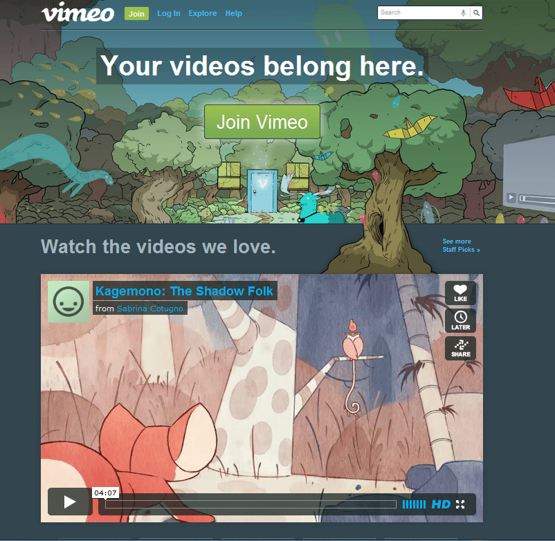 Much as we value YouTube’s popularity, you’ll see one of Vimeo’s advantages over YouTube right away. Here’s what greets you in their front page: