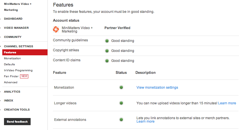 In the past, businesses and many nonprofits could only use annotations on their videos to link within YouTube—not to their own websites. Only nonprofits that had joined the YouTube Nonprofit Program could directly link to their website from an overlay on a YouTube video. Now, if your YouTube account is in good standing, you can link any of your videos to an Associated Website within your Google account. Accounts have good standing unless you give YouTube a reason to restrict you, so most are. Once logged into Google, you can check here to find an accounting like the one on the left. If the top three items say you’re a member in good standing, you’re good to go.