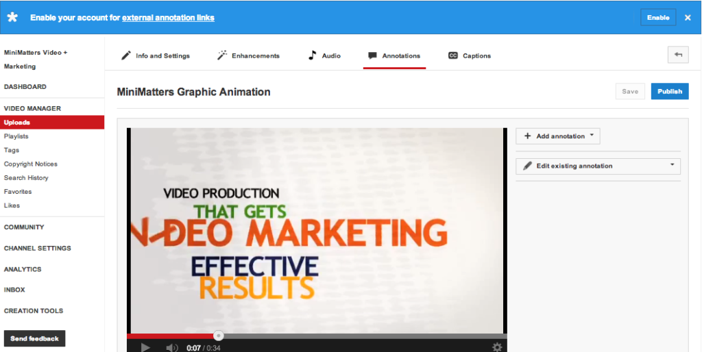 Now that your website is an Associated Website, you can enhance your website marketing by adding a link to your website instead of just having to link within YouTube. Depending on the type of video you’re annotating, you may have different ideas for which part of our website you should link. Since we were annotating a basic animated video that pitches our services, it was obvious to us to link the end of the video to our website’s homepage. The video we linked to our website gives a tiny introduction to our services; prospective clients will probably want to get more information before getting in touch. But you might want to link a landing page with a direct call to action, such as a click-to-buy spot, or click-to-donate, or click-for-an-estimate, instead.